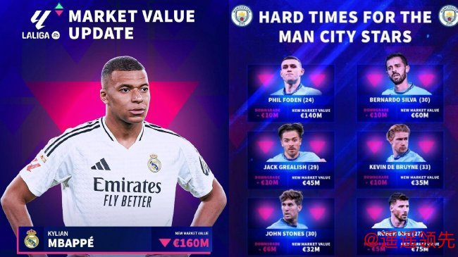 10月身价更新后,皇马身价13.6亿欧,曼城12.6亿欧。12月身价更新后,皇马跌至12.3亿欧,曼城跌至11.9亿欧。